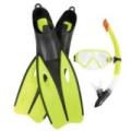 Snorkelsæt i grønne med svømmefødder, snorkel og dykkermaske. _x000D__x000D_Dykkermasken kan justeres i størrelsen. Snorklen har et tætsluttende silikone mundstykke, som sikrer, at vandet bliver holdt ude. Svømmefødderne er i str. 38-39. _x000D__x000D_Sættet leveres i en taske. (Læs mere)